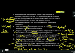 1. Everyone who has graduated from Topnotch High School has an intelligence quotient (IQ) of over 120. Most students with an IQ of over 120 and all students with an IQ of over 150 who apply to one or more Ivy League universities are accepted to at least one of them. The statements above, if true, best support which of the following conclusions?