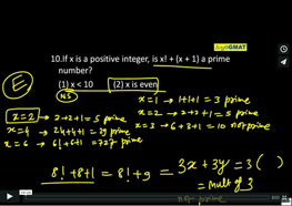 10. If x is a positive integer, is x! + (x + 1) a prime number? (1) x < 10 (2) x is even