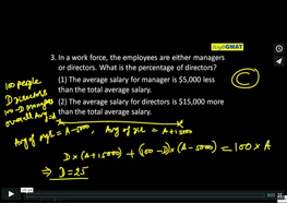 3. In a work force, the employees are either managers or directors. What is the percentage of directors? (1) The average salary for manager is $5,000 less than the total average salary. (2) The average salary for directors is $15,000 more than the total average salary.
