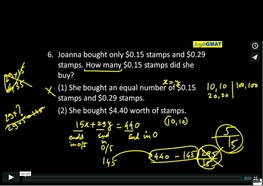 6. Joanna bought only $0.15 stamps and $0.29 stamps. How many $0.15 stamps did she buy? (1) She bought an equal number of $0.15 stamps and $0.29 stamps. (2) She bought $4.40 worth of stamps.