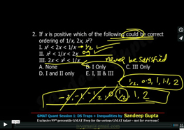 2. If x is positive which of the following could be correct ordering of 1/x, 2x, x^2? I. x^2< 2x < 1/x II. x^2< 1/x < 2x III. 2x < x^2< 1/x