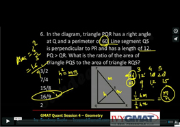 3. In FIGURE 1, triangle PQR has a right angle at Q and a perimeter of 60. Line segment QS is perpendicular to PR and has a length of 12. PQ > QR. What is the ratio of the area of triangle PQS to the area of triangle RQS?